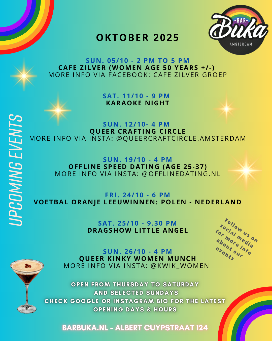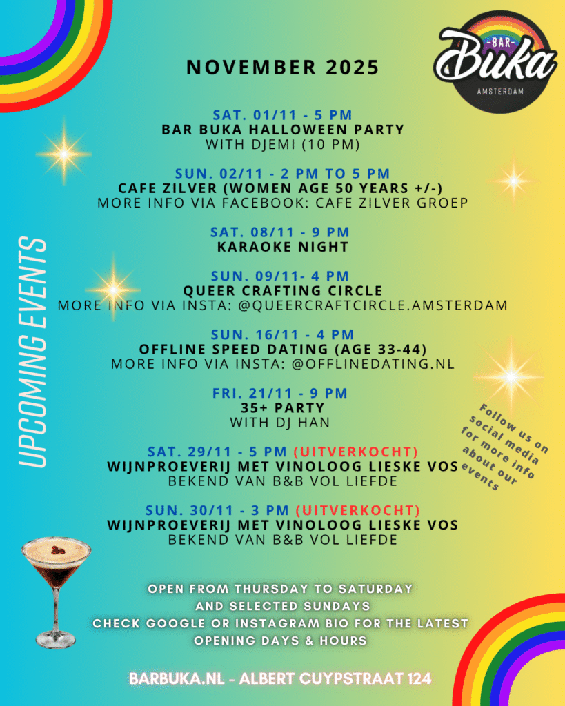 Bar Buka focuses on creating a safe and fun space for women and the lesbian community, but our doors are open to everyone. Men, non-binary people, and allies are always welcome at our queer friendly space in Amsterdam.