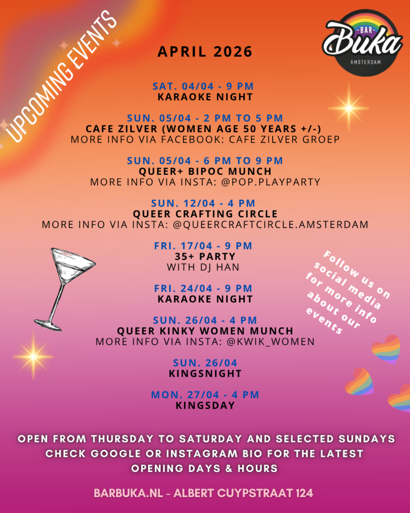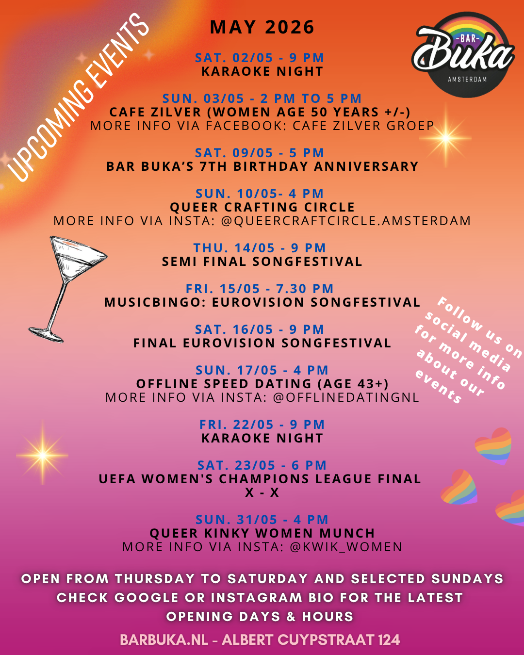 Bar Buka is dedicated to creating a safe and fun space for women and the lesbian community, while warmly welcoming the entire LGBTQ+ community and allies. Our doors are open to everyone — women, men, trans people, non-binary people, and anyone who feels at home in a queer-friendly space in Amsterdam.